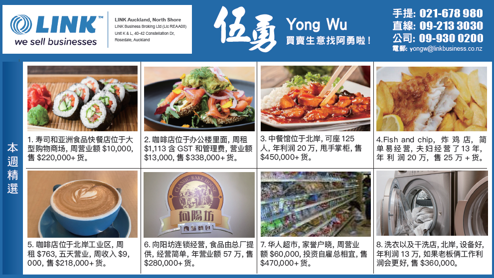 21 年前有对夫妇来找我买生意,先生是厨师,太太是楼面经理,像这样的组合,买一个地段好,租金便宜的餐馆,怎么做都没有问题,所以当年我就介绍了一家韩国餐馆给他们,因为这家餐馆完全符合以上的要求。作为厨师的先生,为了更加方便自己的工作,所以当年花了不少钱改造了厨房,一晃21年过去了,丰衣足食,置田置业,小孩也成家立业了,也是退休享福的时候了,希望把这个生意交给有缘人,发扬光大,如果你们是这样的人,请告诉我,价钱好商量!目前餐馆BYO 酒牌,可以容纳100人,周租金才$835 含GST,目前周营业收入$15,000, 叫价$198,000+货。