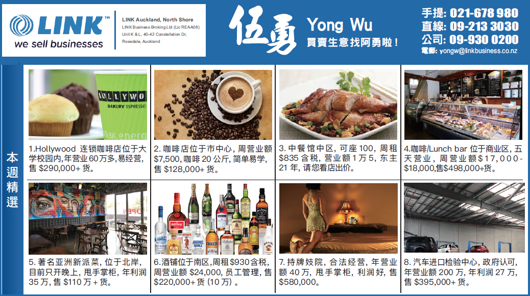 讲到生意买卖,奥克兰的华人朋友许多都知道“伍勇”, 20多年从事生意买卖行业的经验,秉着“专业,诚信,负责”的态度,不单是从业最久的,也是最为大家认可的生意买卖华人经纪人,“买卖生意找阿勇”早已经成为众多买家卖家的方向。各大中文报纸的“伍勇讲生意”专栏是许多华人朋友了解,经营生意的的平台。在过去服务的公司里,获得六年销售冠军,并且当选为2011年新西兰华人经济人物。LINK North Shore 是LINK旗下的独立加盟商,获得2017年新西兰房地产协会小型生意买卖公司的第一名,伍勇先生也以LINK全国2017年销售第一名的成绩获得新西兰房地产协会生意销售2017年前三强。LINK North Shore是以伍勇为主导的第一家华人生意买卖专业公司,我们将以更加专业,诚信,负责的团队来为广大华人朋友服务,无论你人在新西兰还是在新西兰外的国家,我们都会为你提供丰富的资讯,真诚的服务,专业的指导,让你在这美丽的国土上安居乐业!