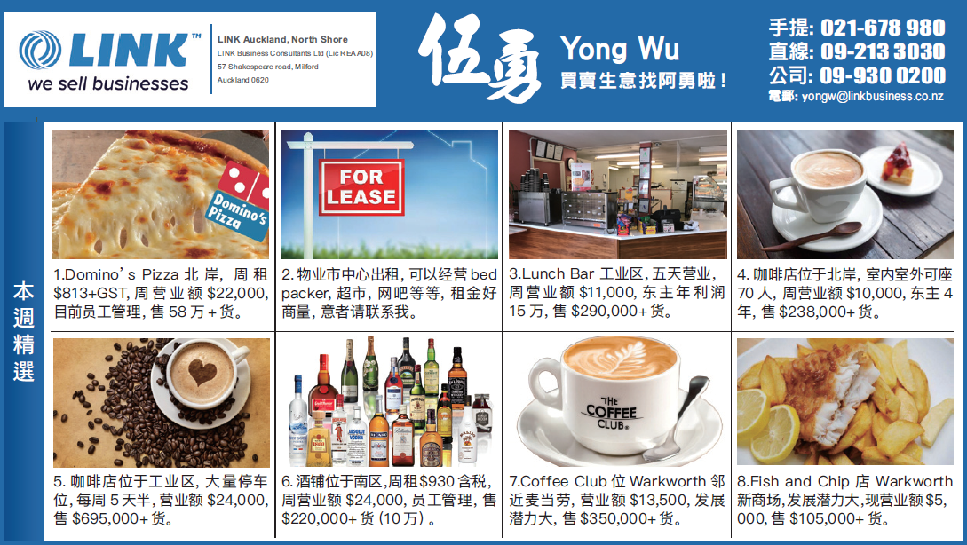 讲到生意买卖,奥克兰的华人朋友许多都知道“伍勇”, 20多年从事生意买卖行业的经验,秉着“专业,诚信,负责”的态度,不单是从业最久的,也是最为大家认可的生意买卖华人经纪人,“买卖生意找阿勇”早已经成为众多买家卖家的方向。各大中文报纸的“伍勇讲生意”专栏是许多华人朋友了解,经营生意的的平台。在过去服务的公司里,获得六年销售冠军,并且当选为2011年新西兰华人经济人物。LINK North Shore 是LINK旗下的独立加盟商,获得2017年新西兰房地产协会小型生意买卖公司的第一名,伍勇先生也以LINK全国2017年销售第一名的成绩获得新西兰房地产协会生意销售2017年前三强。LINK North Shore是以伍勇为主导的第一家华人生意买卖专业公司,我们将以更加专业,诚信,负责的团队来为广大华人朋友服务,无论你人在新西兰还是在新西兰外的国家,我们都会为你提供丰富的资讯,真诚的服务,专业的指导,让你在这美丽的国土上安居乐业!