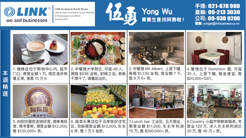 第四,买一个投资回报适合你自己的生意,花多少钱买生意取决于你有多少钱,也取决于你想赚多少钱。作为买家,当然是希望利益最大化,但每一个行业都是有一定的回报规律,并且新西兰。生意买卖市场相对透明,花多少钱就买什么样的生意,买什么样的生意就可能可以得到多少的利润。如何去决定投多少钱呢?就拿现在这个疫情引起的一些人失业,他因为找不到相应的工作,而去买一盘生意的时候作为例子。你的资本投入首先就要以你所希望的收入水平为基础,比如说你以前一年的收入是10万,如果想保持过去这个10万的收入水平,你就应该去买一个能够有年利润10万的生意,因为不同的生意有不同的市场价,你可能花15-20万 就可以买一个年利润10万的快餐店生意,但你却要花20-30万才能买到一个年利润10万的咖啡店生意,这就像同样是车,从几万到十几万或者更多买到不同牌子的车,还有就像买房子,同样3房,不同的地区价钱可能翻倍或者更多。所以作为买家,同样的行业也要货比三家,这样你才能买到一个好的市场价,我们不期待买了最便宜的,但也不愿意买了“高价”,货真价实才是我们希望的。