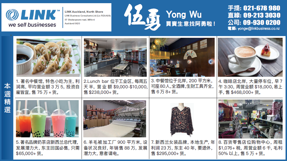 讲到生意买卖,奥克兰的华人朋友许多都知道“伍勇”, 20多年从事生意买卖行业的经验,秉着“专业,诚信,负责”的态度,不单是从业最久的,也是最为大家认可的生意买卖华人经纪人,“买卖生意找阿勇”早已经成为众多买家卖家的方向。各大中文报纸的“伍勇讲生意”专栏是许多华人朋友了解,经营生意的的平台。在过去服务的公司里,获得六年销售冠军,并且当选为2011年新西兰华人经济人物。LINK North Shore 是LINK旗下的独立加盟商,获得2017年新西兰房地产协会小型生意买卖公司的第一名,伍勇先生也以LINK全国2017年销售第一名的成绩获得新西兰房地产协会生意销售2017年前三强。LINK North Shore是以伍勇为主导的第一家华人生意买卖专业公司,我们将以更加专业,诚信,负责的团队来为广大华人朋友服务,无论你人在新西兰还是在新西兰外的国家,我们都会为你提供丰富的资讯,真诚的服务,专业的指导,让你在这美丽的国土上安居乐业!